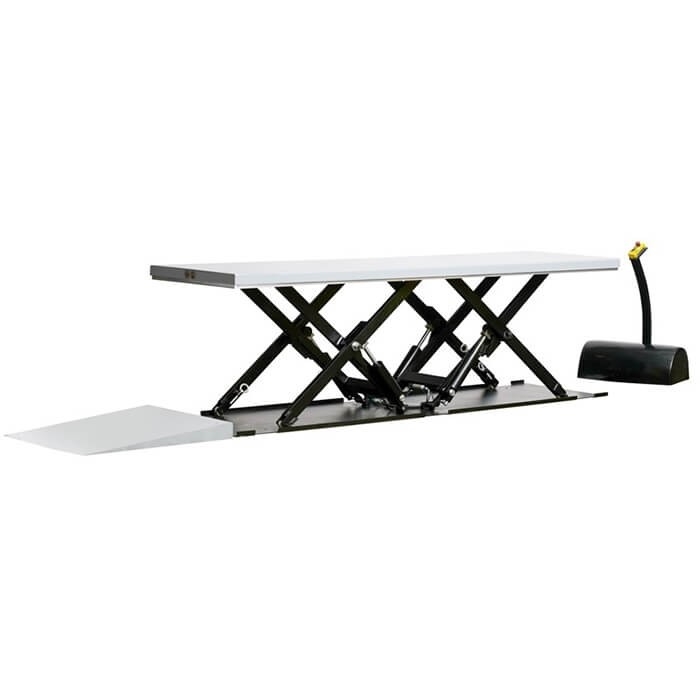 Low profile scissor lift table with high quality tandem scissors and 1000kg lift capacity. Easily load with a pallet truck without the need to install the lift table in a pit. *A pallet truck can be run up the small ramp, directly on to the table. The low profile lift table comes with a free standing motor and hydraulic pump with control box on the floor.