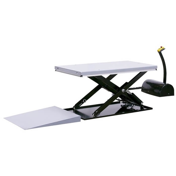 Low profile scissor lift table with high quality single scissor and 2000kg lift capacity. Easily load with a pallet truck without the need to install the lift table in a pit. *A pallet truck can be run up the small ramp, directly on to the table. The low profile lift table comes with a free standing motor and hydraulic pump with control box on the floor.