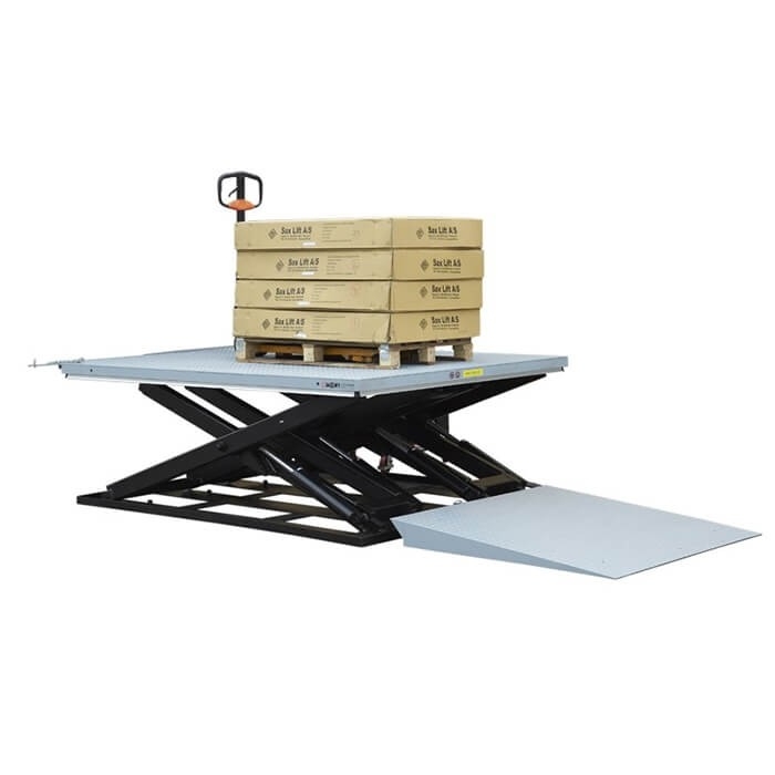 Low profile scissor lift table with high quality single scissor and 2500kg lift capacity. The extra large platform allows for lift of large heavy items. Easily load with a pallet truck without the need to install the lift table in a pit. *A pallet truck can be run up the small ramp, directly on to the table. The low profile lift table comes with a free standing motor and hydraulic pump with control box on the floor.