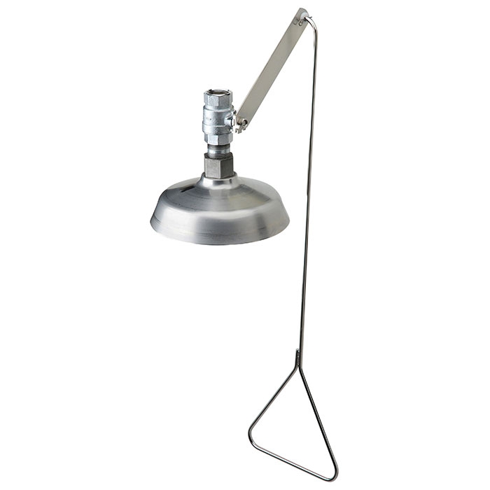 Vertically mounted emergency shower with a plastic or stainless steel shower head and a 1" stay-open ball valve with a pull rod.