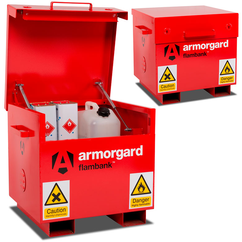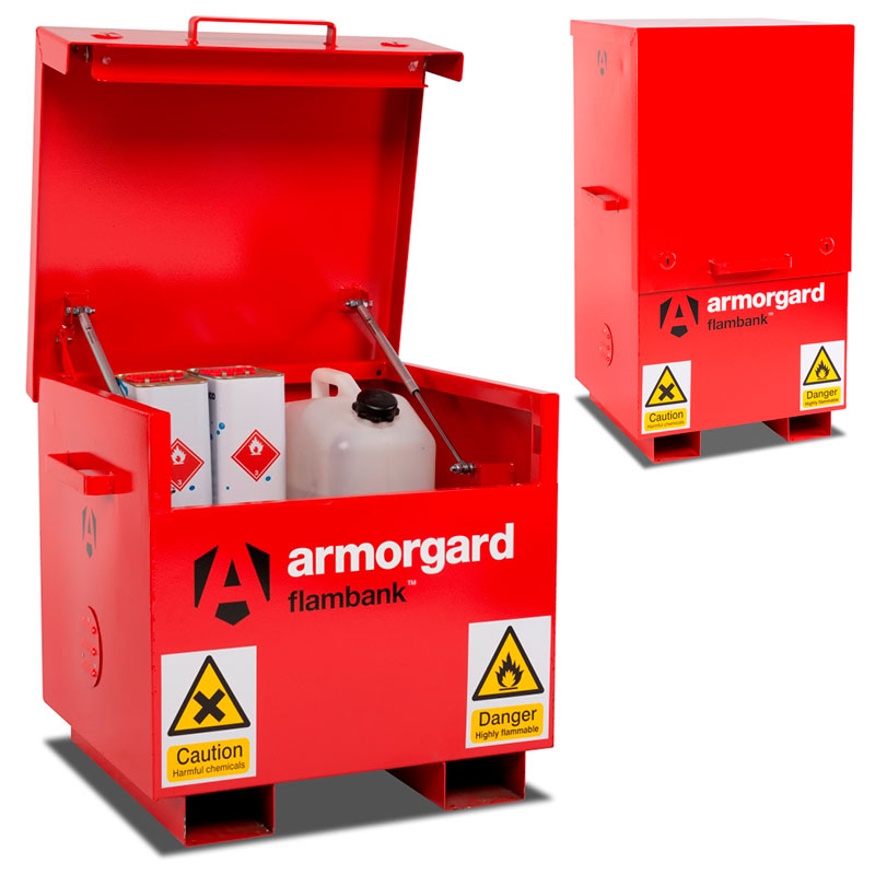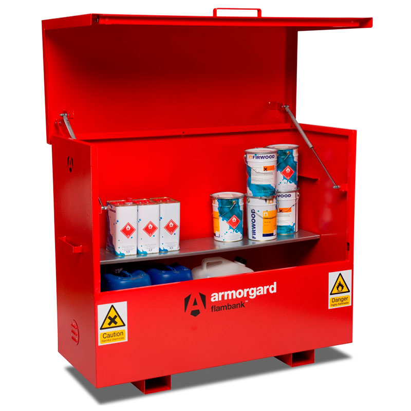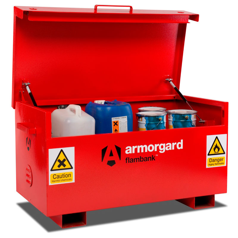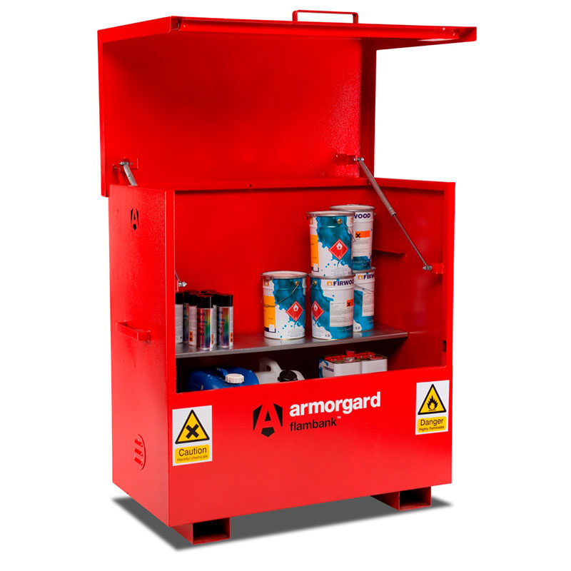 - Hazardous storage vaults are finished in bright red with relevant hazard warning signs fitted as standard
