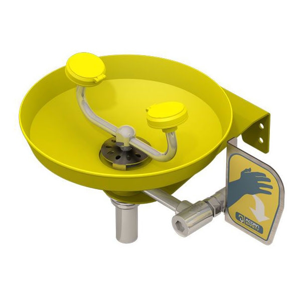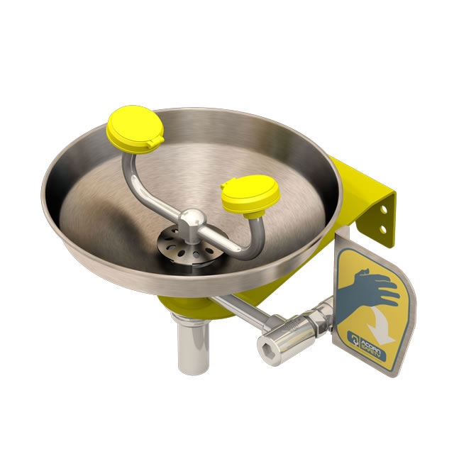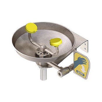 Wall mounted eye/face wash, with a plastic or stainless steel bowl, ABS plastic eye/face wash spray heads, an inline strainer and a stay-open 1/2" ball valve with a push handle.