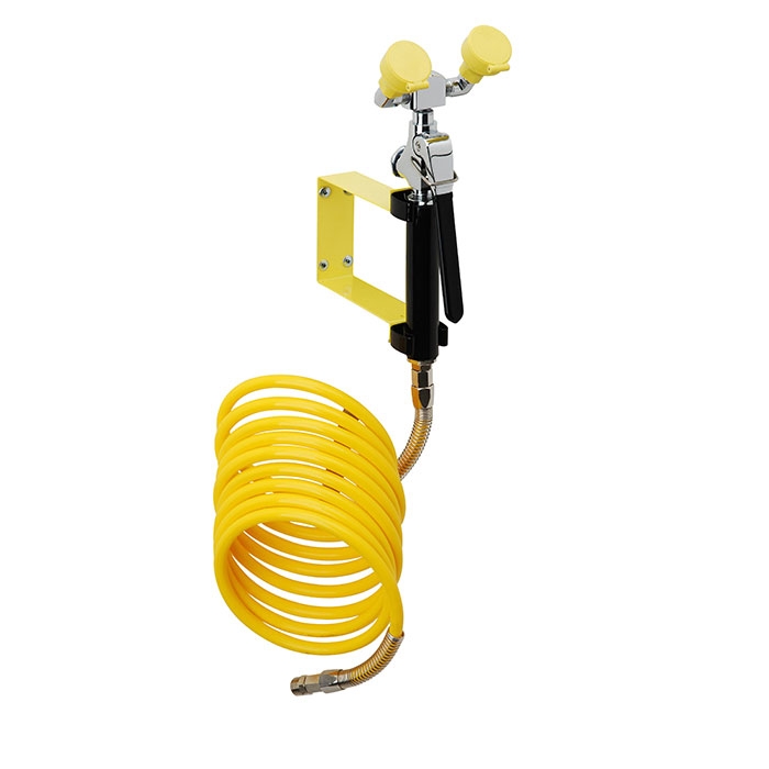 Wall mounted eye/face and body drench hose with an ABS plastic eye/face wash spray head, stay-open squeeze lever valve and a 2438 mm reinforced PVC hose. NOTE: ANSI Z358.1 – 2014 states that drench hoses are used as supplements, but do not replace other types of emergency equipment.