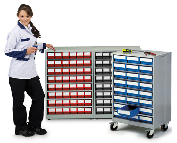 - Each cabinet includes a Grey epoxy enamelled steel frame, colour bins, labels and protective shields